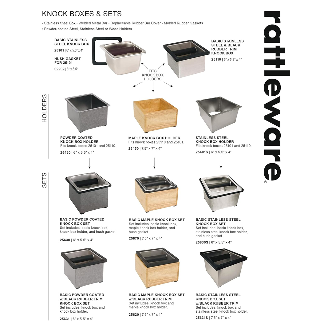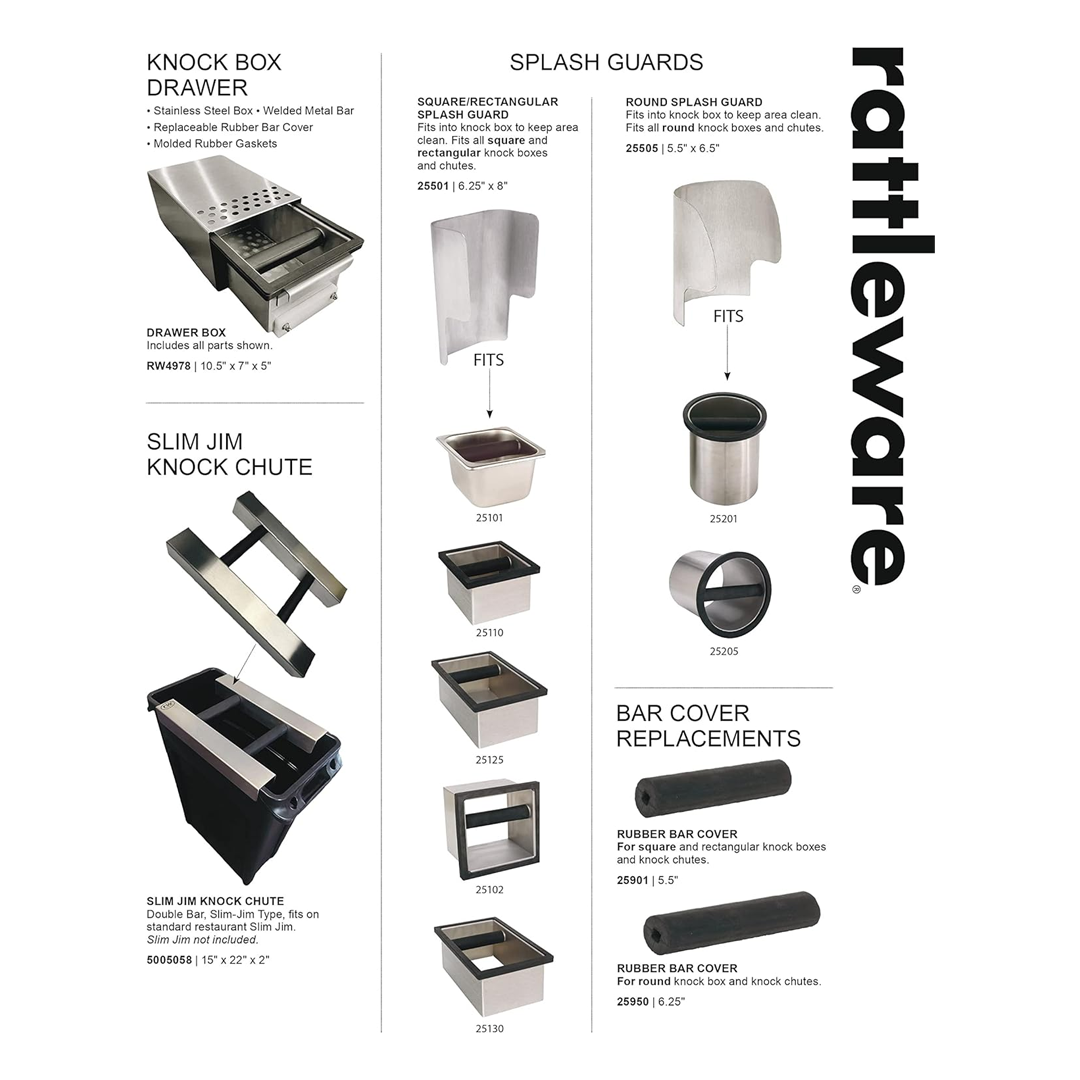 This round knock box is made from heavy duty stainless steel featuring a welded metal bar for durability. It has a replaceable rubber bar cover and an edge gasket made of molded rubber. This knock box is designed for commercial use. Replacement rubber bar covers are sold separately. Knock box measures 6.25" x 7.5"